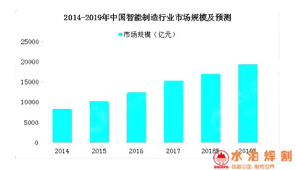 在國家政策推動,制造業(yè)技術轉型升級等背景下,中國智能制造產業(yè)發(fā)展迅速,對產業(yè)發(fā)展和分工格局帶來深刻影響。數據顯示,2017年中國智能制造行業(yè)市場規(guī)模為15150億元,增長率為22.6%,伴隨著技術的逐漸完善,應用產業(yè)的不斷拓展,市場規(guī)模將持續(xù)增長,預計2019年市場規(guī)模將超19000億元。