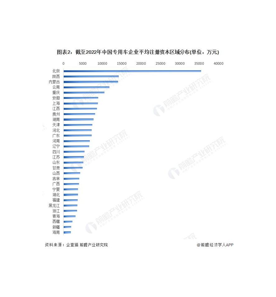 根據中國企業數據庫企查貓,目前中國專用車企業的平均注冊資本區域分布中,北京企業的平均注冊資本最高,達到 35468 萬元。